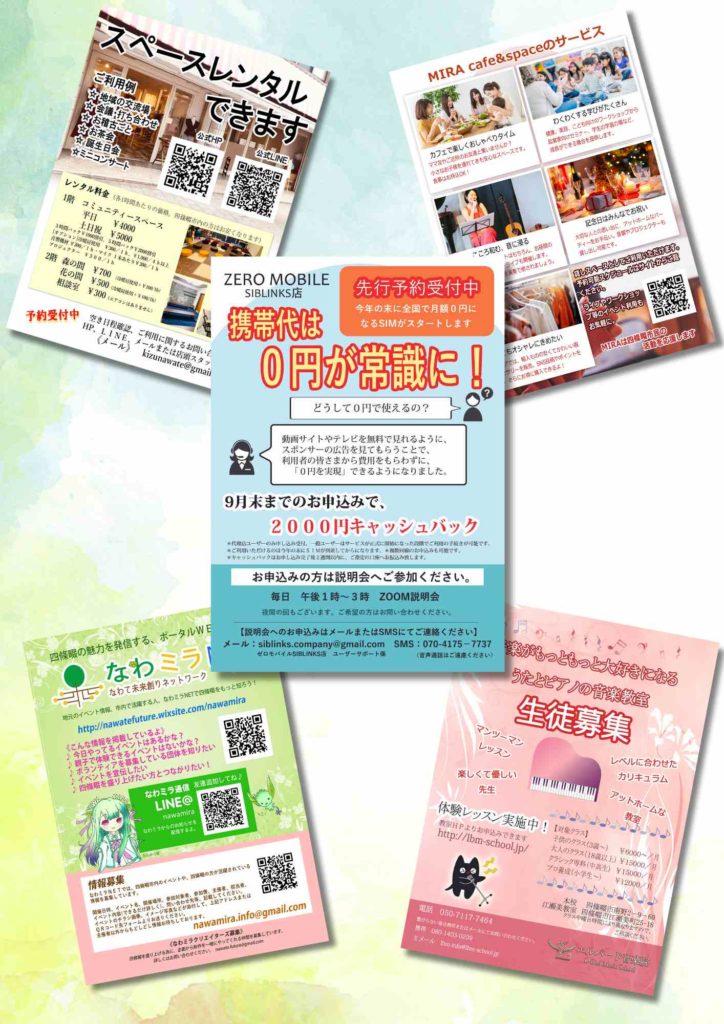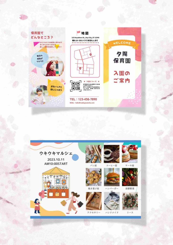 企業パンフレット、イベントのチラシ、求人のポスター、飲食店メニュー表、ビジネス名刺、ポイントカード、商品カタログ